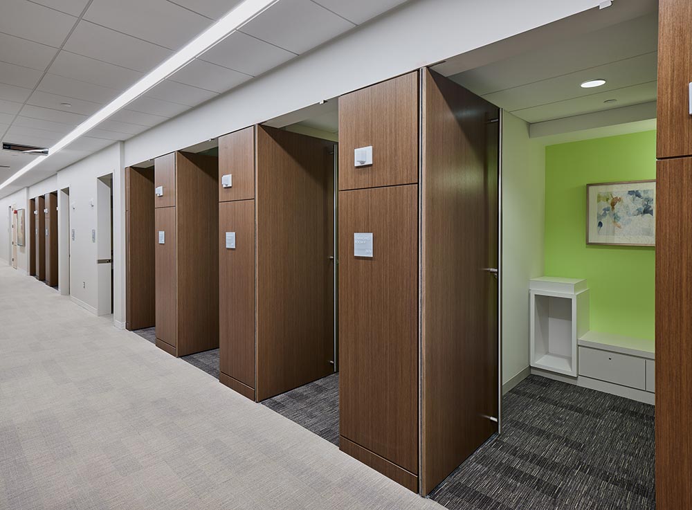 Landcross Linea American Walnut used as surface for changing rooms, wood doors and cabinets.