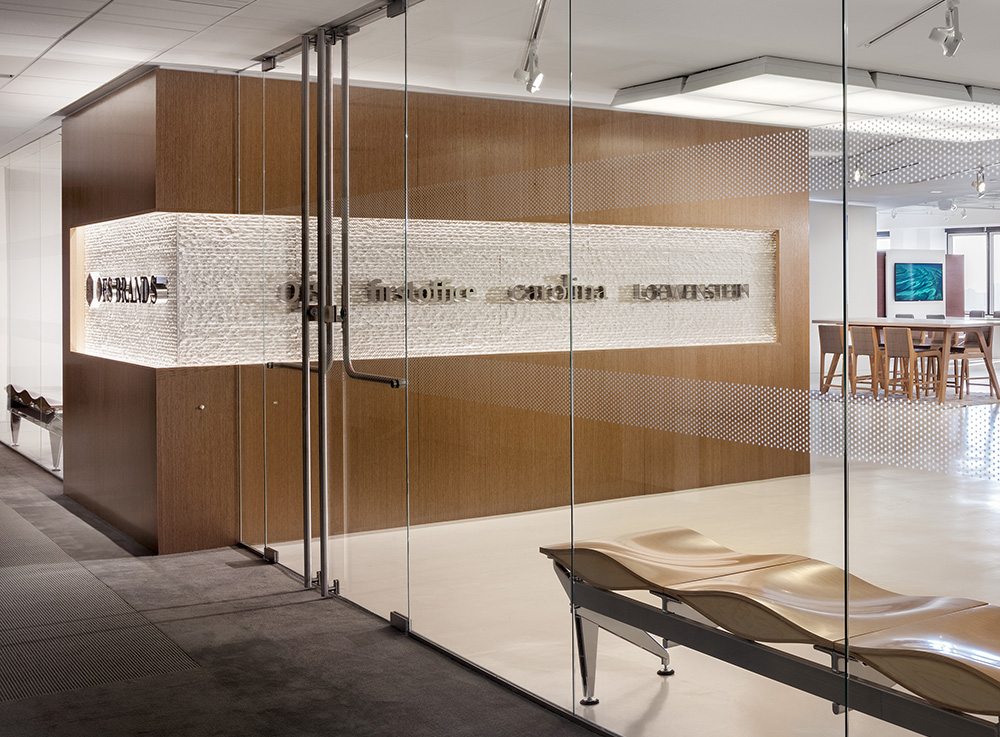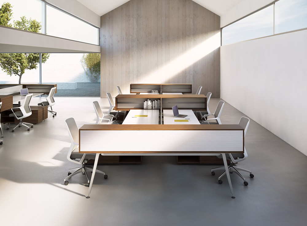 OFS office furniture brand offers their award winning Slate and Eleven workstations with practical and elegant Landcross Linea hardwood surfaces. Swiss architect and designer Daniel Korb developed Eleven around a fundamental concept: “Furniture is Architecture on a Different Scale.” This inspires a seamless blend of furniture functionality, connectivity, storage, and media integration that harmonizes with interior architecture.